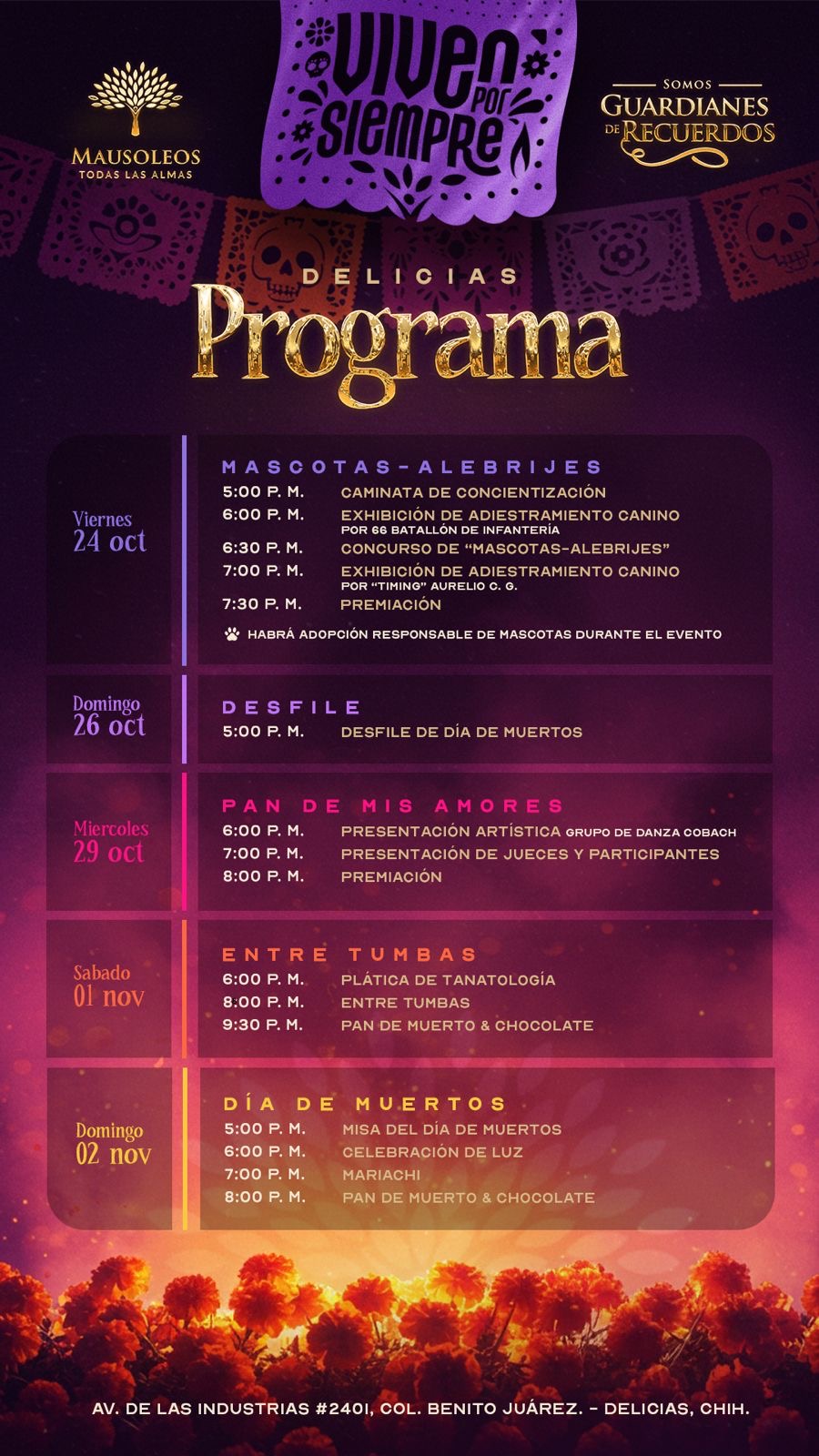 Todas las actividades se llevarán a cabo en Mausoleos Todas las Almas, ubicado en Av. de las Industrias #2401, Col. Benito Juárez, Delicias, Chihuahua.