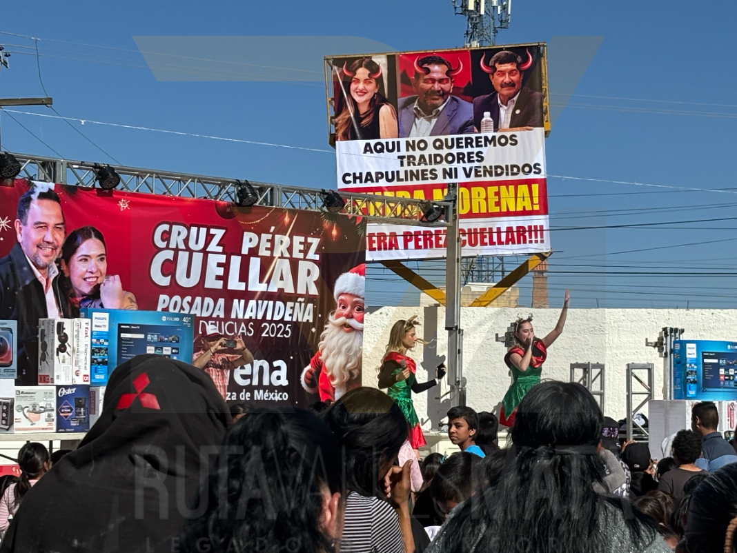 Delicias, Chih.— Un grupo numeroso de productores agrícolas se manifestó de manera pacífica la tarde-noche de este lunes en la Macroplaza de Delicias, durante la realización de la posada organizada por Cruz Pérez Cuéllar, en protesta por la aprobación de la reforma a la Ley de Aguas Nacionales.