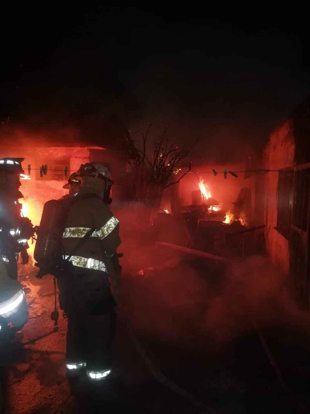 Gracias a la oportuna y efectiva intervención del Cuerpo de Bomberos de Delicias, fue sofocado un incendio registrado en el patio de un domicilio ubicado en la colonia Carmen Serdán, donde se acumulaba una gran cantidad de madera y basura, lo que provocó que el fuego se propagara con rapidez.