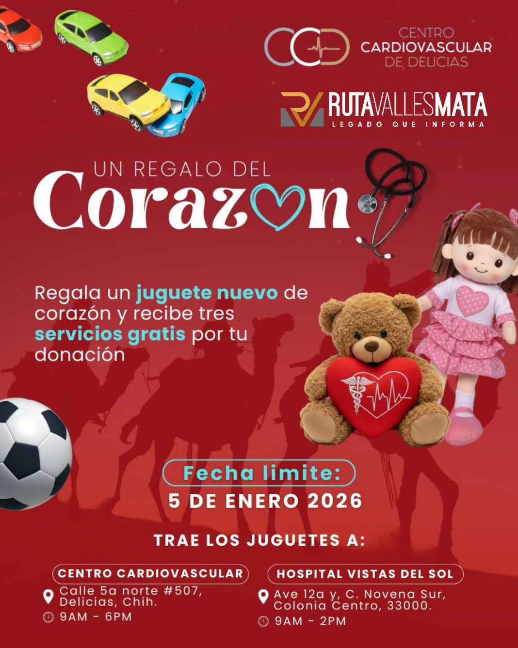 Delicias, Chih.— La campaña solidaria “Un Regalo del Corazón”, impulsada por el Centro Cardiovascular de Delicias, continúa registrando una respuesta positiva por parte de la ciudadanía, consolidándose como un éxito gracias al apoyo de personas que se han sumado para llevar alegría a niñas y niños de la ciudad este próximo Día de Reyes.