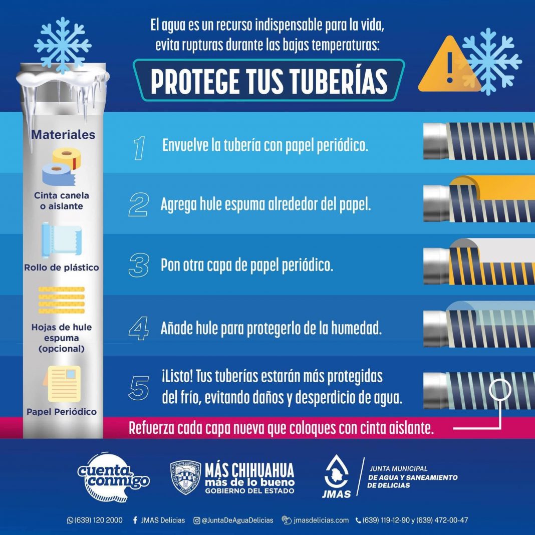 La Junta Municipal de Agua y Saneamiento de Delicias informó que durante las bajas temperaturas es común que las tuberías expuestas se congelen y revienten, lo que puede provocar daños en los hogares y afectaciones al suministro.