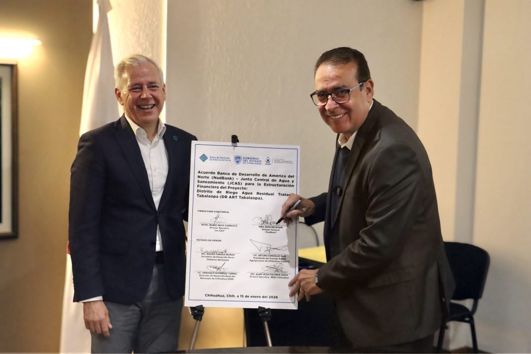 La Junta Central de Agua y Saneamiento del Estado de Chihuahua (JCAS) y el Banco de Desarrollo de América del Norte (NADBank) firmaron un acuerdo de estructuración técnica y financiera para el proyecto de Mejoras en el Distrito de Riego Tabalaopa, enfocado en el reúso de aguas residuales tratadas y la modernización de la infraestructura agrícola e hidráulica.