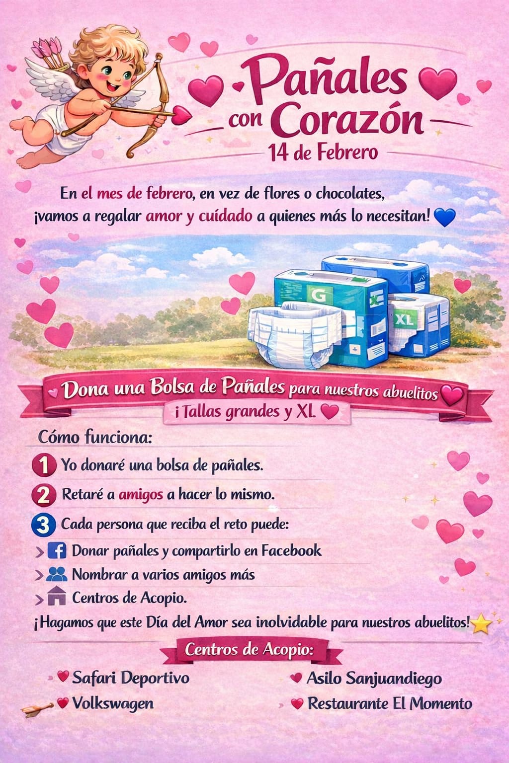 Ana Sánchez, integrante del equipo del Asilo San Juan Diego, informó que la campaña pretende cambiar el significado tradicional del 14 de febrero, invitando a la ciudadanía a regalar amor y cuidado a quienes más lo necesitan, a través de la donación de bolsas de pañales en tallas grandes y extra grandes.