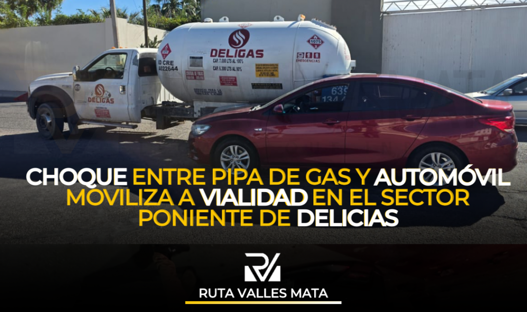 Delicias, Chih.– Un accidente vial entre una pipa de gas y un vehículo particular se registró la tarde de este sábado en el cruce del boulevard Comisión Nacional de Irrigación (Conai) y la calle 5a, en el sector poniente de la ciudad.