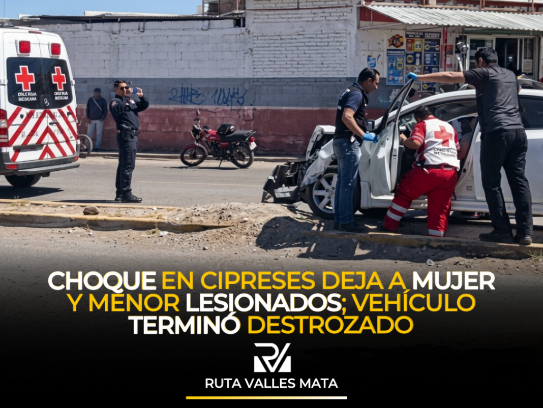 Delicias, Chih.– Un fuerte accidente vial se registró en el fraccionamiento Cipreses, en el cruce de la avenida Solidaridad y calle Abeto Noble, donde una mujer y un menor de edad resultaron lesionados tras el impacto entre dos vehículos.