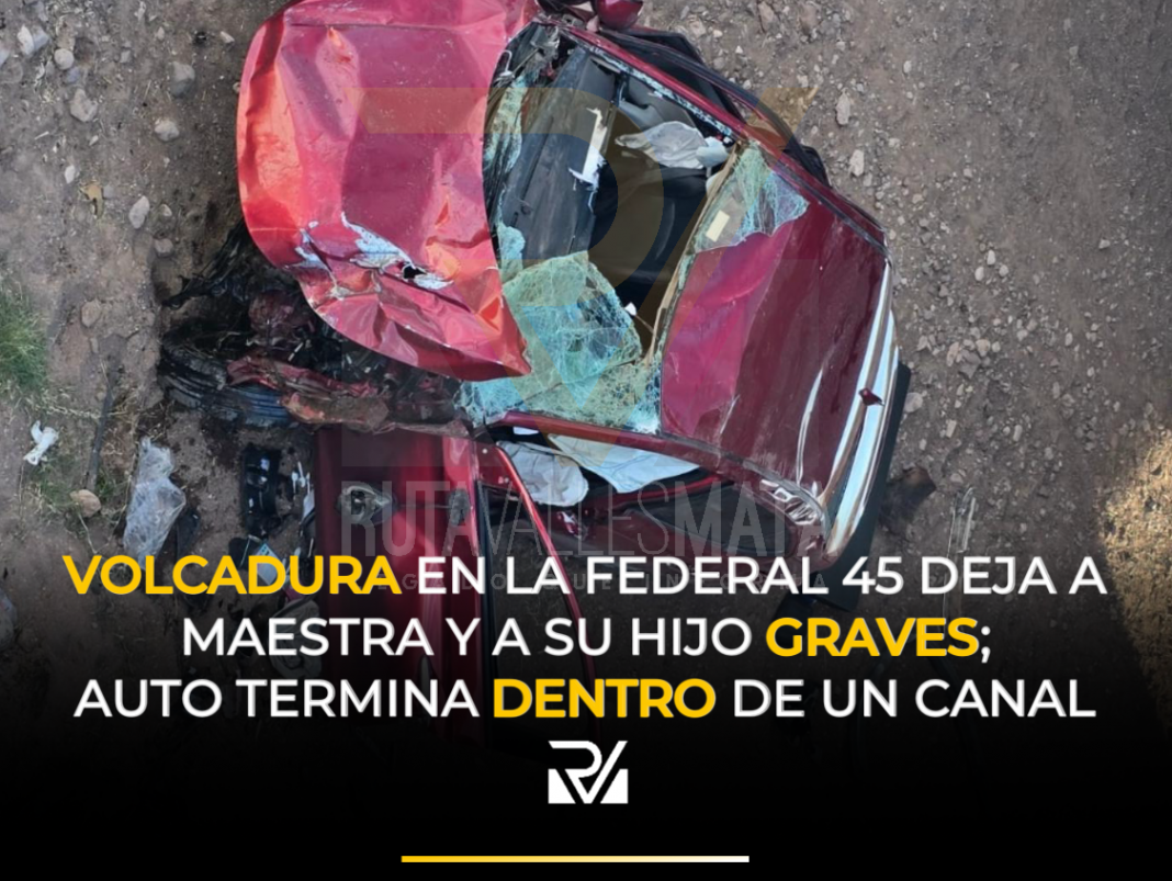VOLCADURA EN LA FEDERAL 45 DEJA A MAESTRA Y A SU HIJO GRAVES; AUTO TERMINA DENTRO DE UN CANAL