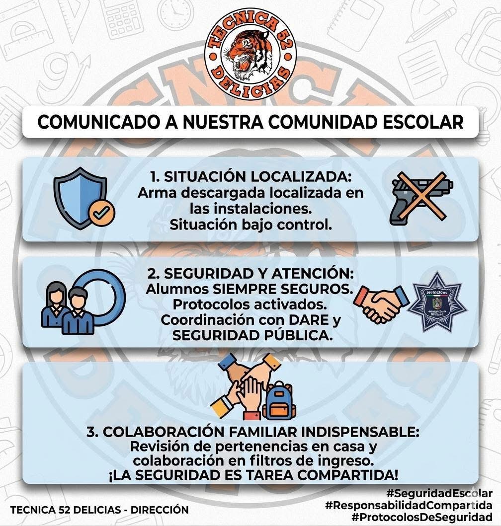 En el mismo comunicado, la dirección hizo un llamado directo a madres y padres de familia para fortalecer la revisión de lo que sus hijos llevan a la escuela y colaborar en los filtros de ingreso, al considerar que la seguridad dentro de la institución también requiere participación desde casa.