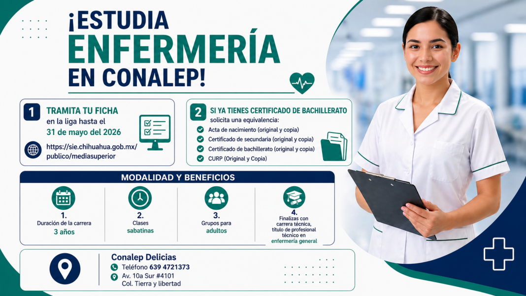 Delicias, Chih.– El plantel Conalep Delicias promueve su oferta educativa en la carrera de Enfermería, dirigida a personas interesadas en formarse como profesionales técnicos en esta área de la salud.